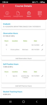 Accedere ai tuoi materiali didattici non è mai stato così fluido. Sia che tu debba rivedere appunti di lezione dettagliati, approfondire video istruttivi o consultare le letture assegnate, tutto il necessario per il tuo studio è immediatamente disponibile all'interno di BASI Pilates. Parallelamente, tracciare le tue ore di pratica autonoma, di insegnamento supervisionato e di osservazione diventa un processo incredibilmente semplice. L'interfaccia intuitiva ti permette di registrare il tuo progresso senza sforzo, assicurando la piena conformità con i requisiti di certificazione.